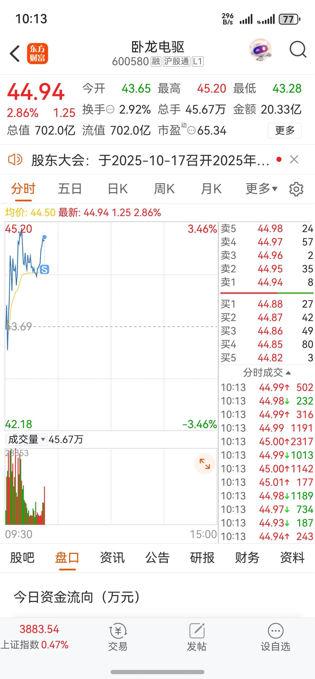 $卧龙电驱(SH600580)$ 第一波没卖,资金一直在流出。先出来。下午再接回来