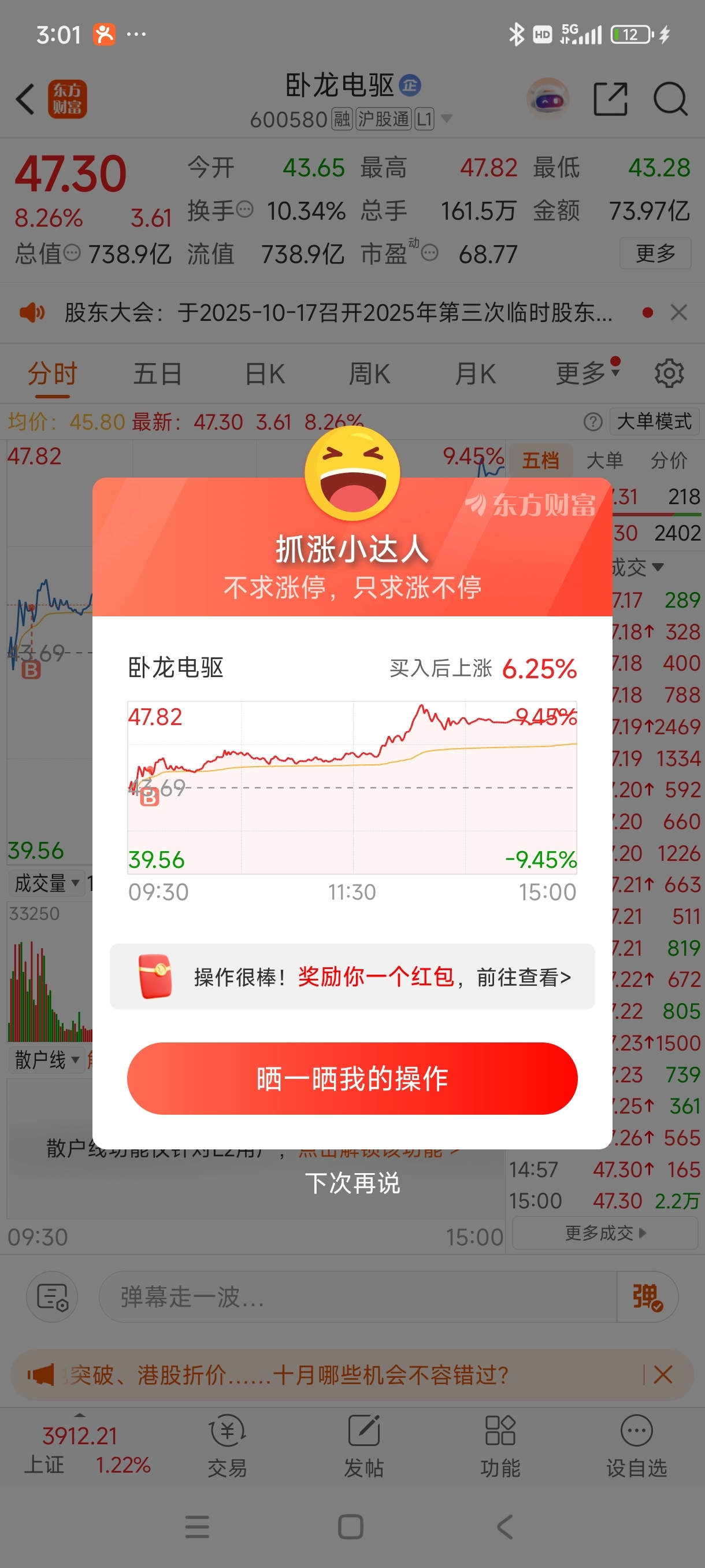 $卧龙电驱(SH600580)$ 今天操作简直完美 早上出了黄河旋风 入了卧龙