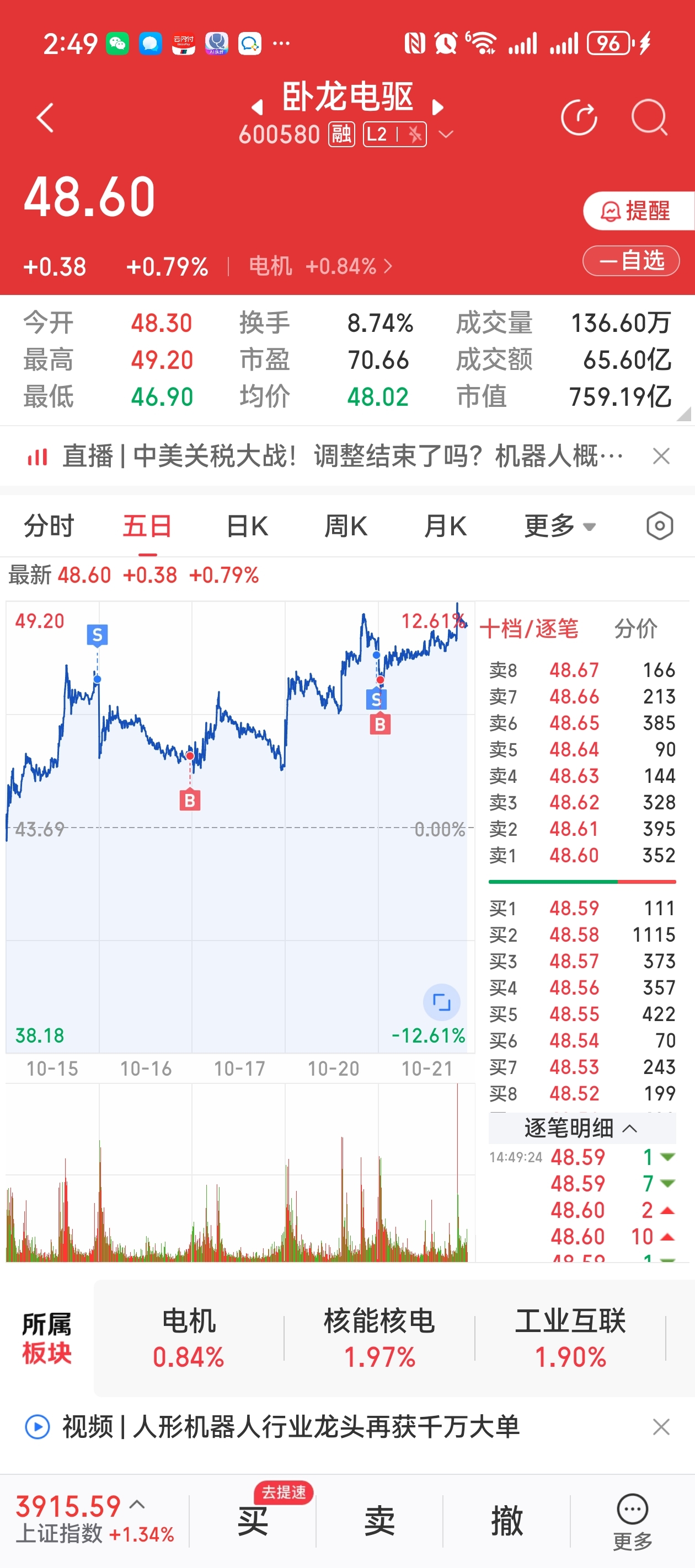$卧龙电驱(SH600580)$ 是不是似曾相识的,感觉明天跌,但是我一看我早晨买的位置,也没必要尾盘T了,明天跌了,买进就是