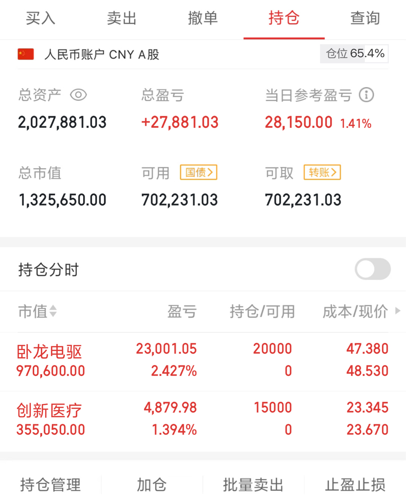 早上水下开仓了$卧龙电驱(SH600580)$ $创新医疗(SZ002173)$ 虽然才赚一点,但是已经很不错了希望明天会更好,也希望跟上的朋友都有好收获哦
