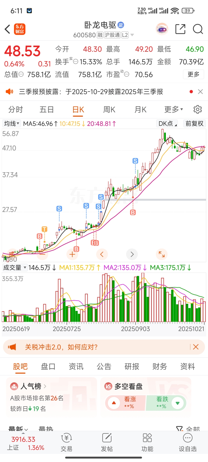 $卧龙电驱(SH600580)$ 19.5的筹码丢了,再也捡不回来了