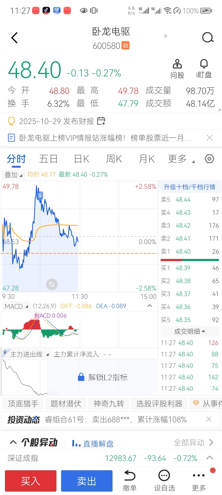 $卧龙电驱(SH600580)$ 恨自己早上为啥不全卖了