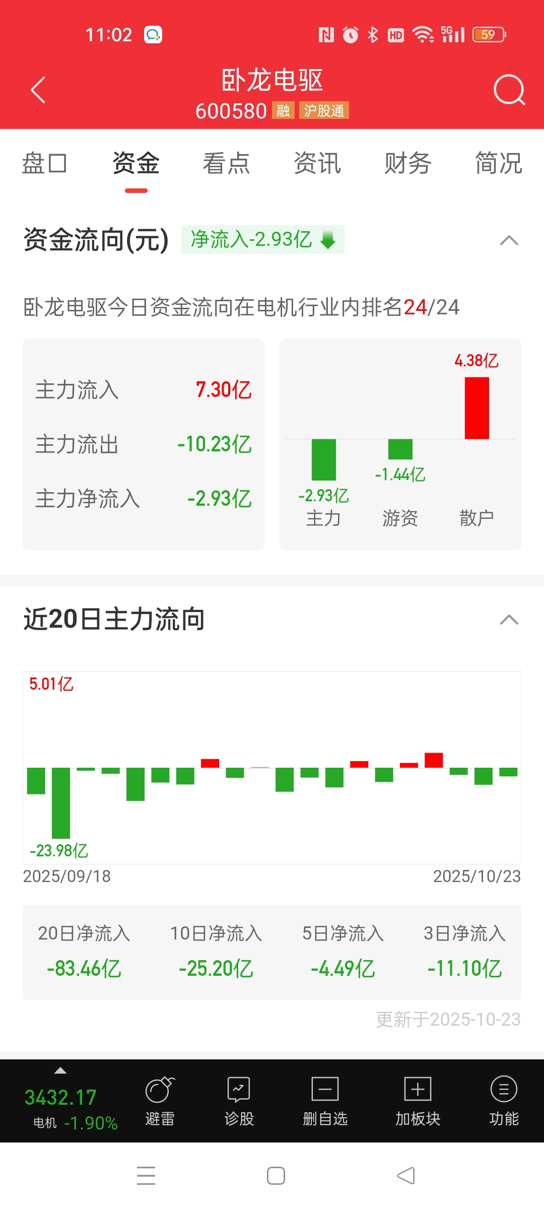 $卧龙电驱(SH600580)$ 主力游资出货散户接盘