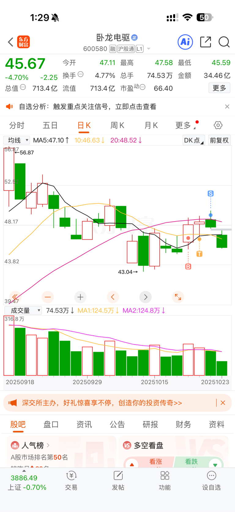 $卧龙电驱(SH600580)$ 昨天我为什么清仓了,因为股吧说要到100。就这么简单