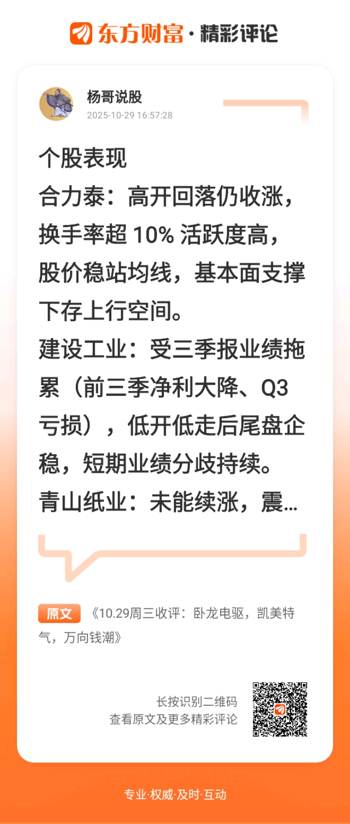 //@杨哥说股 :个股表现合力泰:高开回落仍收涨,换手率超 10% 活跃度高,股价稳站均线,基本面支撑下存上行空间。建设工业:受三季报业绩拖累(前三季净利大降、Q3 亏损),低开低走后尾盘企稳,短期业绩分歧持续。青山纸业:未能续涨,震荡下探至 3.65 元,前期多头趋势未破,回调或为强势休整。指数与盘面:指数:高开稳步攀升,站稳 4000 点并转化为支撑,量能增超千亿,做多共识凝聚,后续有望延续上行。板块:有色金属(铜、锌领涨,大中矿业涨停)、光伏储能(阿特斯、隆基绿能涨停)、海南自贸区(海南发展等涨停)强势;证券、游戏、量子科技轮动;银行、部分福建本地股小幅调整,无碍整体向好。持仓复盘:赛力斯:震荡上行,短期调整尾声,股价站均线上,看好后续空间。$卧龙电驱(SH600580)$:低开修复,承接强、筹码集中,新能源 + 机器人属性支撑趋势,续持。$凯美特气(SZ002549)$:低开高走修复,多头占优显题材韧性,续持。$万向钱潮(SZ000559)$:震荡上行红盘报收,承接稳健,续持看多。核心结论:今日市场情绪向好,指数与量能共振,板块轮动清晰(工业金属、光伏为主线),个股分化但优质标的韧性凸显,后续需关注主线板块持续性与量能维系情况。