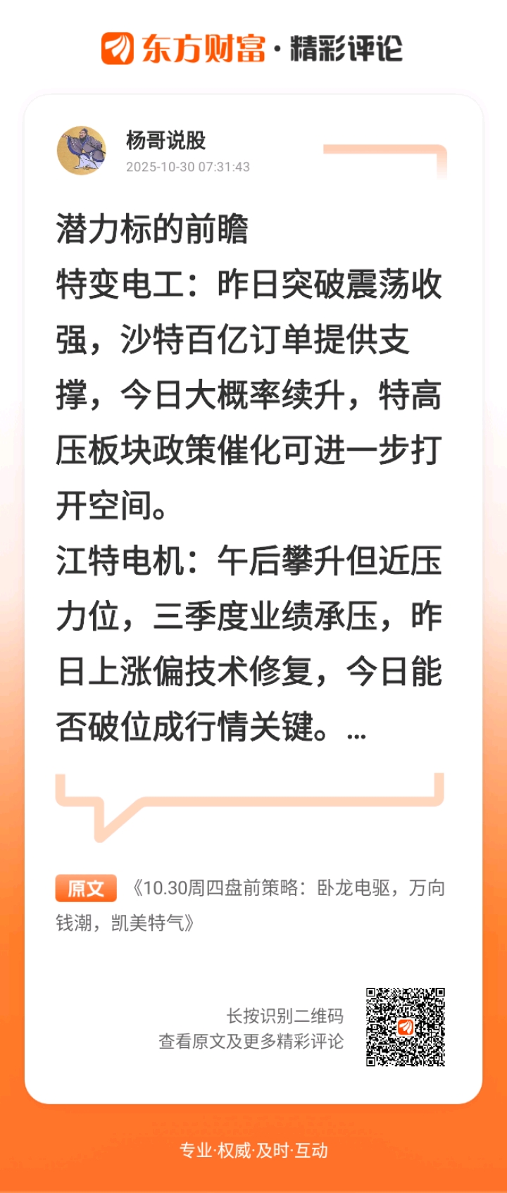 //@杨哥说股 :潜力标的前瞻特变电工:昨日突破震荡收强,沙特百亿订单提供支撑,今日大概率续升,特高压板块政策催化可进一步打开空间。江特电机:午后攀升但近压力位,三季度业绩承压,昨日上涨偏技术修复,今日能否破位成行情关键。英维克:昨日 V 型反弹显低位承接,AI + 储能散热需求托底,守住 75 元支撑则波动或为调整机会,有望冲近期高点。指数与盘面解读指数:昨日站稳 4000 点且量能放超千亿,今日大概率震荡整理,但强势趋势未改,资金或向中小标的扩散,个股补涨机会可期。板块:光伏设备、锂电池昨日领涨,今日有望成核心主线;大科技高位分歧,前期调整板块或迎回流,策略以轮动应对,抓主线与低位补涨。持仓复盘赛力斯:昨日摆脱震荡大涨,业绩与题材共振,今日大概率续强,新能源赛道回暖可进一步打开空间。$卧龙电驱(SH600580)$:昨日震荡微跌,今日需修复跌幅重回 50 元上扭颓势,跌破 48.4 元支撑或陷深调。$凯美特气(SZ002549)$:昨日独立攀升站稳成本线,半导体材料赛道有热度,今日稳住支撑或冲击更高位。$万向钱潮(SZ000559)$:昨日震荡显承接,筹码集中、分歧化解,今日破昨日高点大概率续涨,长期可期。