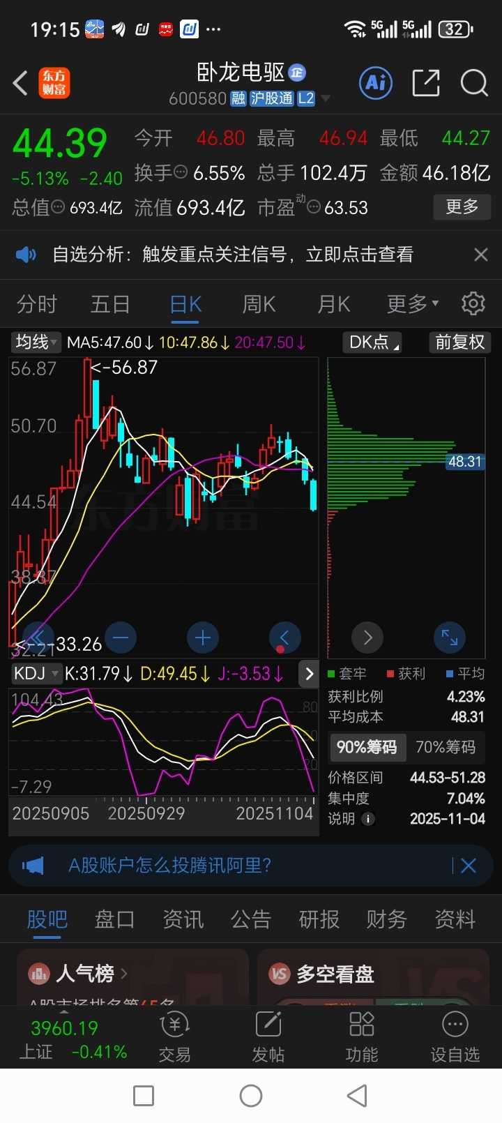 卧龙电驱平均成本48.31(预期最低涨10个点),所有股票持有者最低成本44.5