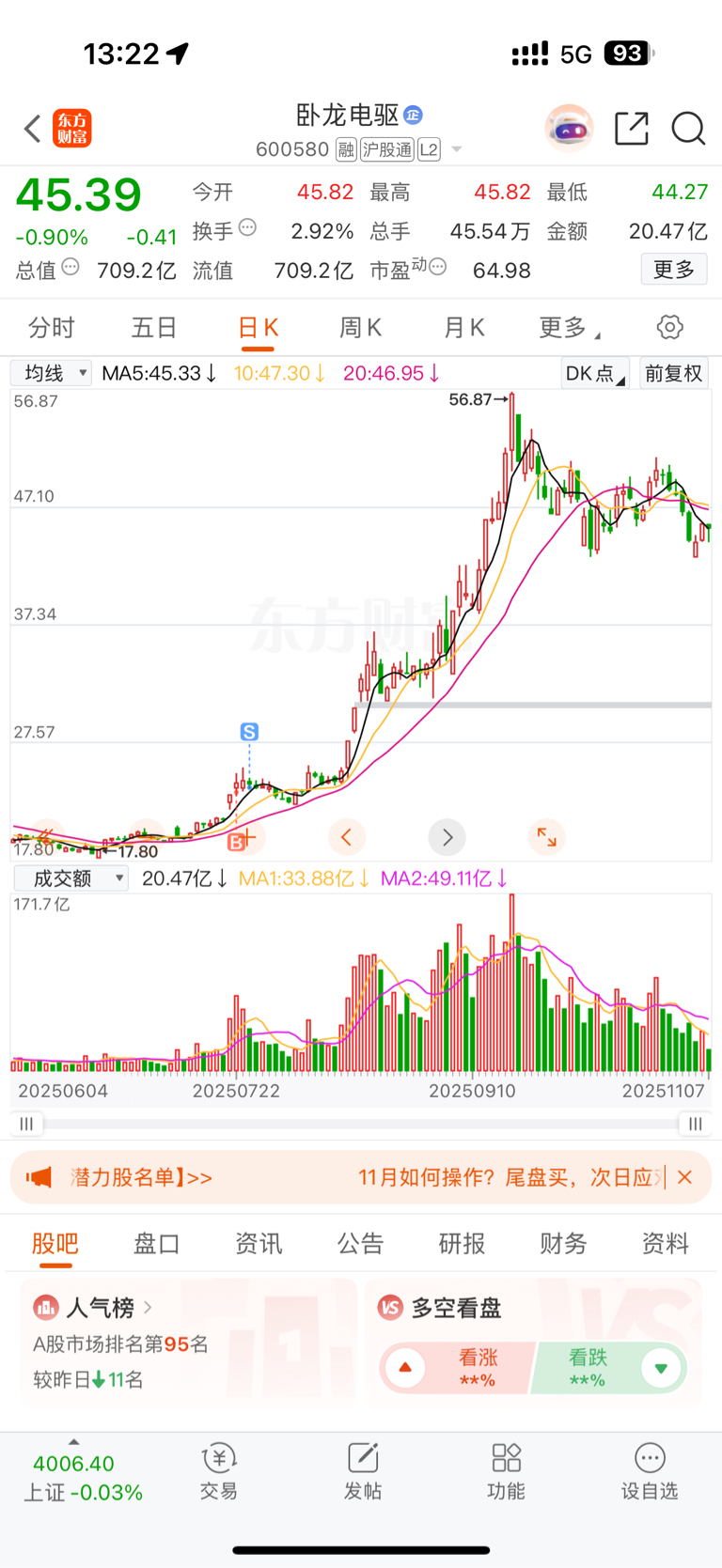 $卧龙电驱(SH600580)$ 韭菜王中王,