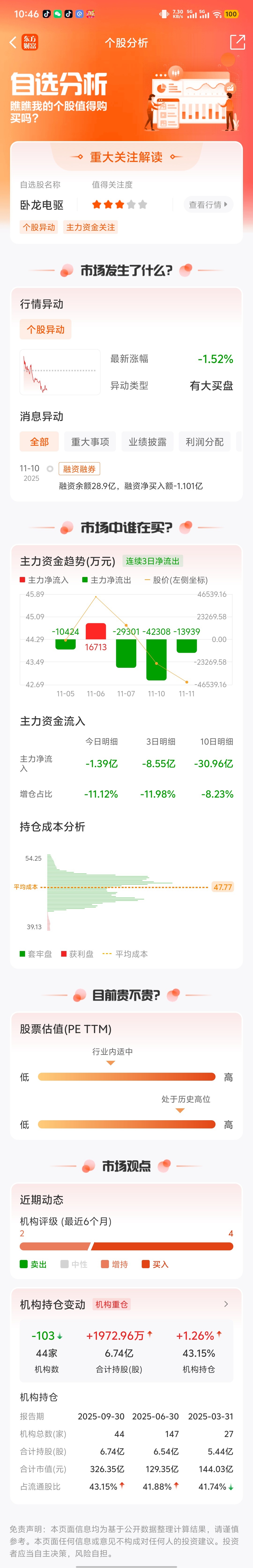 $卧龙电驱(SH600580)$ 做T的玩家考验技术的时候来了,下面40~41元附近应该有很多买盘进来,主力在没有完成计划的之前不会砸破41元,应该还有时间,谨慎操作。我之前也亏了2000多,坐的38~40元再上车吃反弹。我个人的想法,不作为投资建议