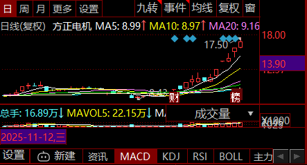 同样的,科技股的应用分支的机器人龙头方正电机也是如此,今天尾盘科技硬件类的纷纷拉起来了,从板块逻辑来说,昨天就提前上涨启动的方正电机没理由不继续强啊。但是它就回落了,收盘只有5.88%!