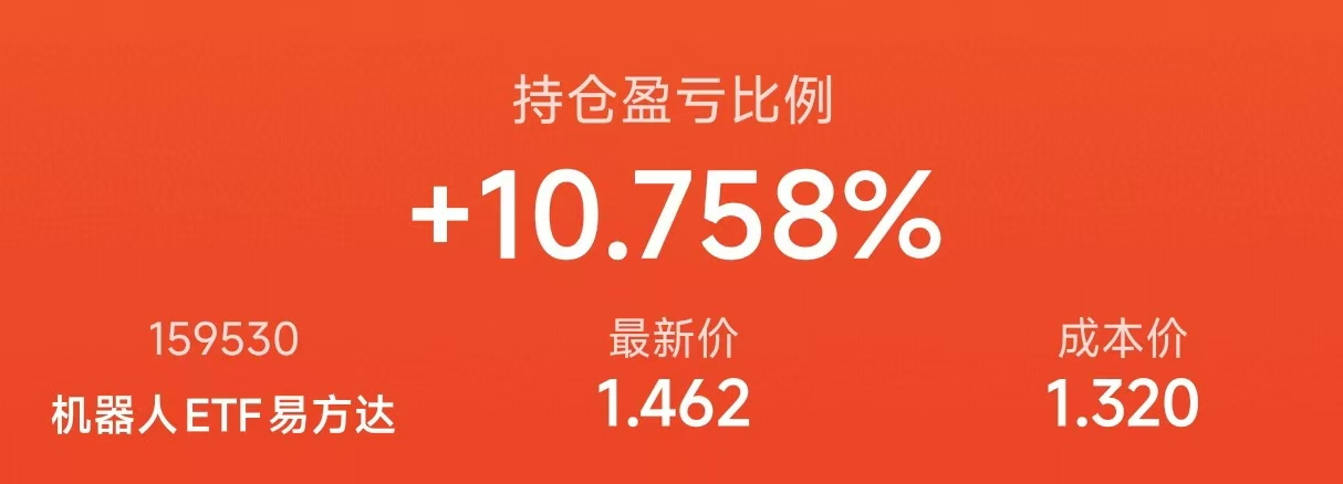 像我配置的$$机器人ETF易方达(SZ159530)$可是拿了很久,就是看好机器人这个方向。而且这个跟其他的板块指数相比下来,人形机器人占比更高的,在行情驱动的时候,按理说弹性会更好一点!
