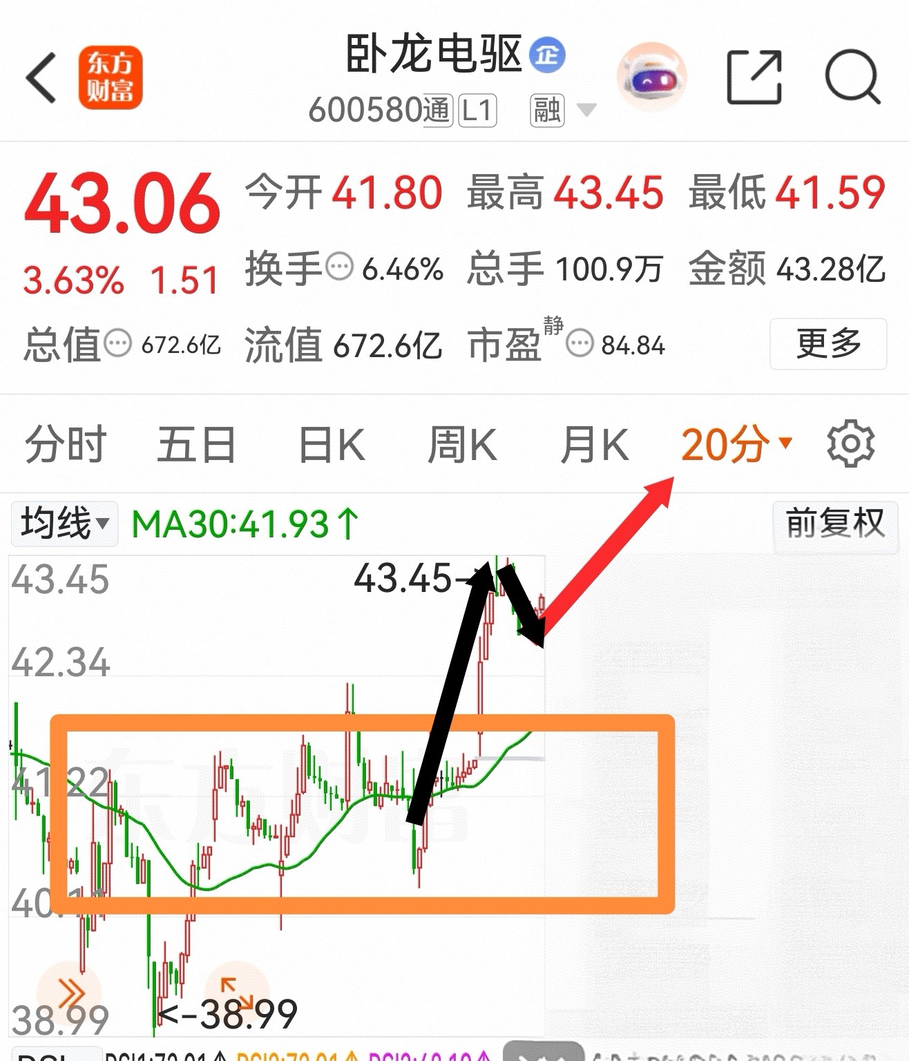 卧龙电驱是宇树机器人概念,周线回调中,短线上20分钟看能不能过43.45,能过就扶摇直上,不能过就会重新回到箱体内震荡。
