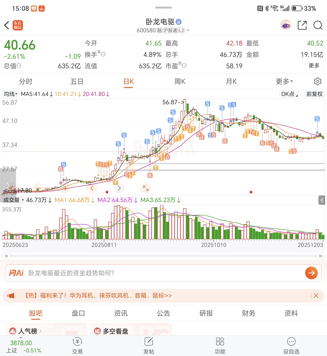 $卧龙电驱(SH600580)$ 这个票被量化收割坏了,相信这样没有高度,庄出货不应该,底已经到38.99,现在就看庄什么时候启动,一年一只股,等待吧