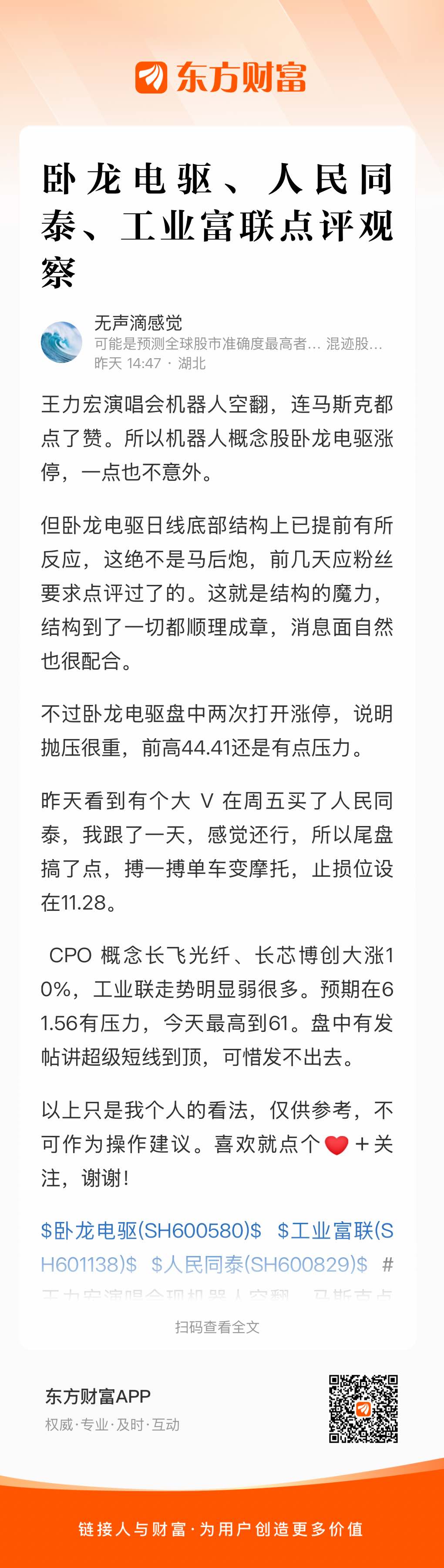 $卧龙电驱(SH600580)$ $工业富联(SH601138)$ $人民同泰(SH600829)$ #王力宏演唱会现机器人空翻,马斯克点赞# #社区牛人计划# #盘逻辑:深度解析,理清投资思路# #强势机会# #股市怎么看# @股吧话题 @社区精选