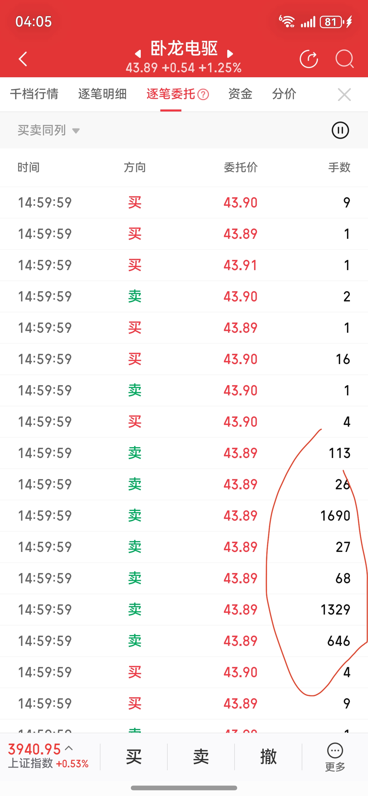 尾盘集合竞价出现多个大单卖出,这只是截图一部分,主力大量抛单
