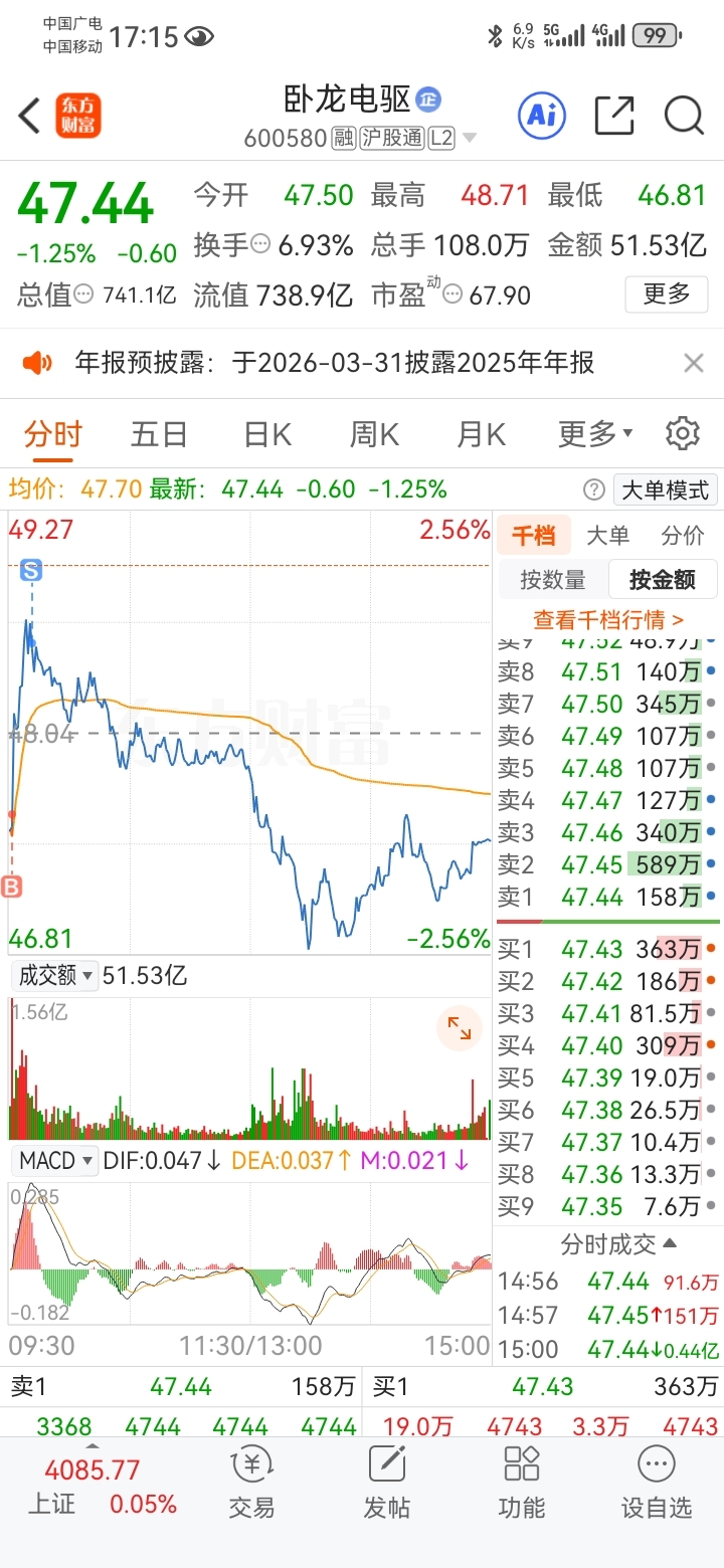$卧龙电驱(SH600580)$ 做了T,但是成本大概49,不知道还能不能到本