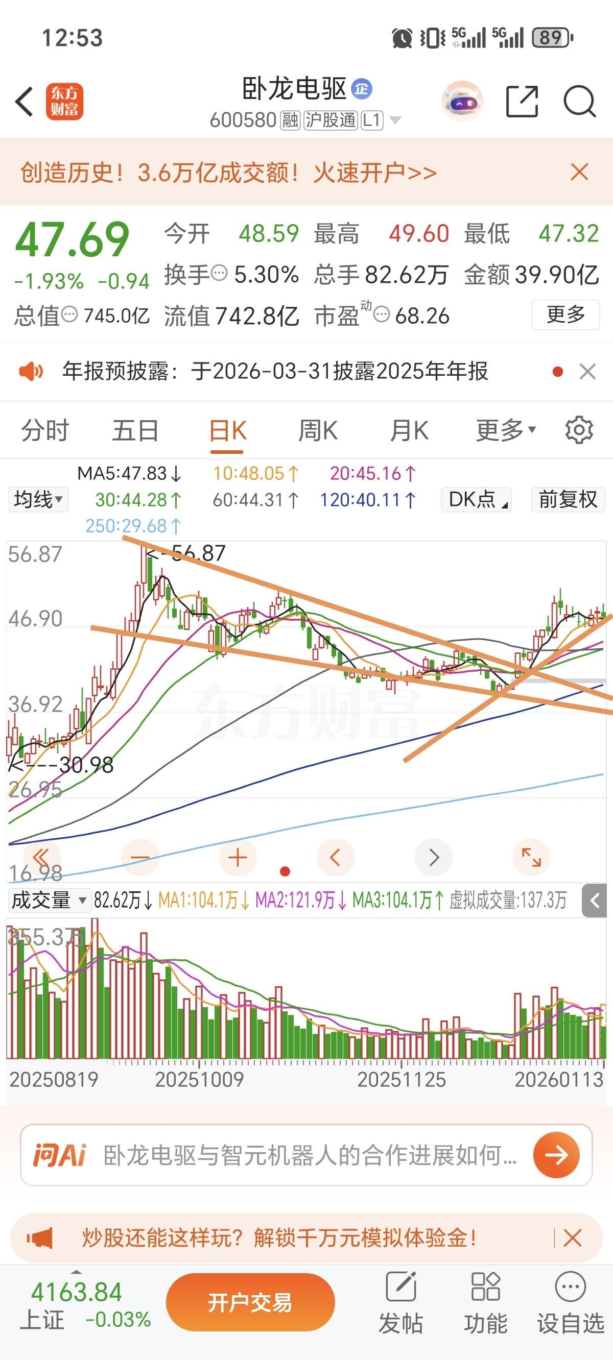 $卧龙电驱(SH600580)$ 卧龙这个走势没啥大惊小怪的,宇树没有按期提交申请,资金臆测为国家给植物人降温,实际上宇树是要将25年财务状况补充到招股说明书里,一月底前提交申请。目前下跌趋势已经结束(如图),两根大阳线已确定反转,目前维持震荡洗盘。静待宇树申请受理。