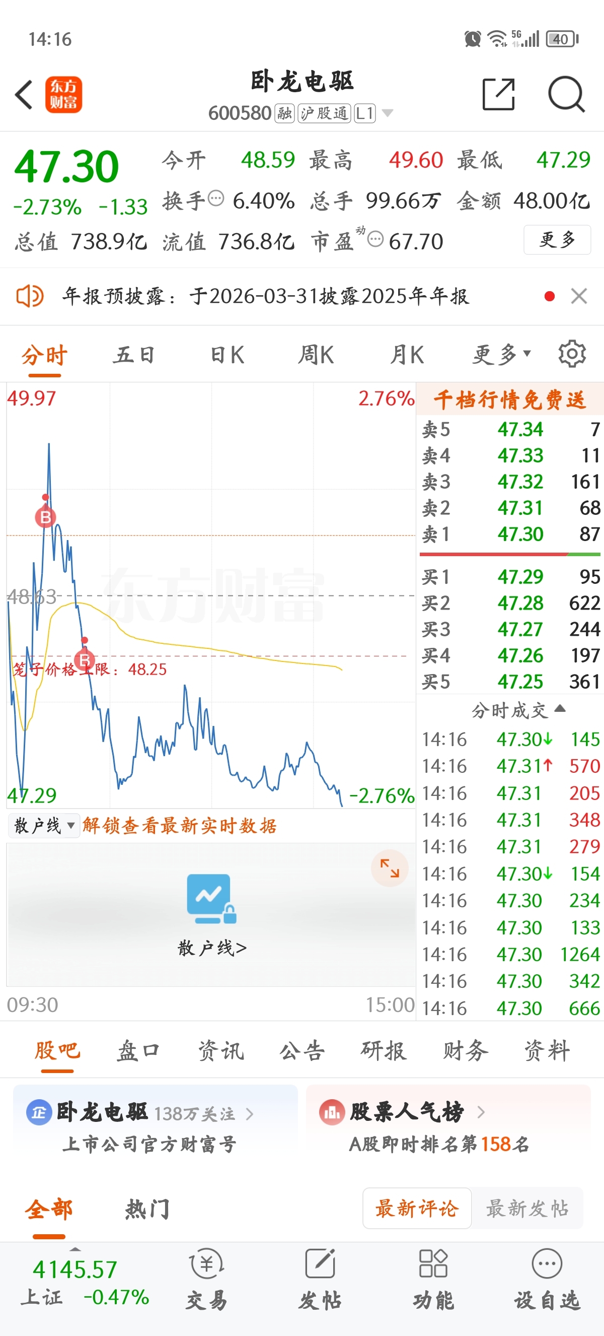 $卧龙电驱(SH600580)$ 很难过
