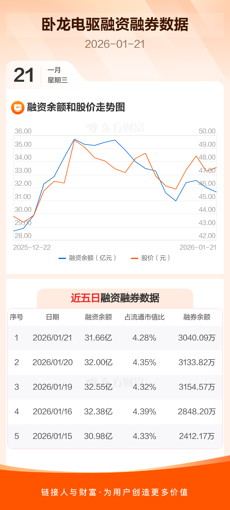 交易所最新数据显示,卧龙电驱于2026年1月21日获融资买入2.76亿元,融资偿还3.11亿元,当日融资净偿还3434.79万元。目前,该股融资余额31.66亿,占流通市值比例为4.28%。