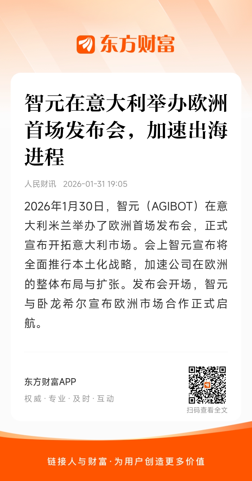 2026年1月30日,智元(AGIBOT)在意大利米兰举办了欧洲首场发布会,正式宣布开拓意大利市场。会上智元宣布将全面推行本土化战略,加速公司在欧洲的整体布局与扩张。发布会开场,智元与卧龙希尔宣布欧洲市场合作正式启航。为确保在意大利的本土化部署与运营可靠性,智元宣布与意大利领先的工业系统集成商SIR Spa达成战略合作。SIR将提供系统集成、现场部署及运营支持,确保人形机器人解决方案深度适配本地工业与服务环境。