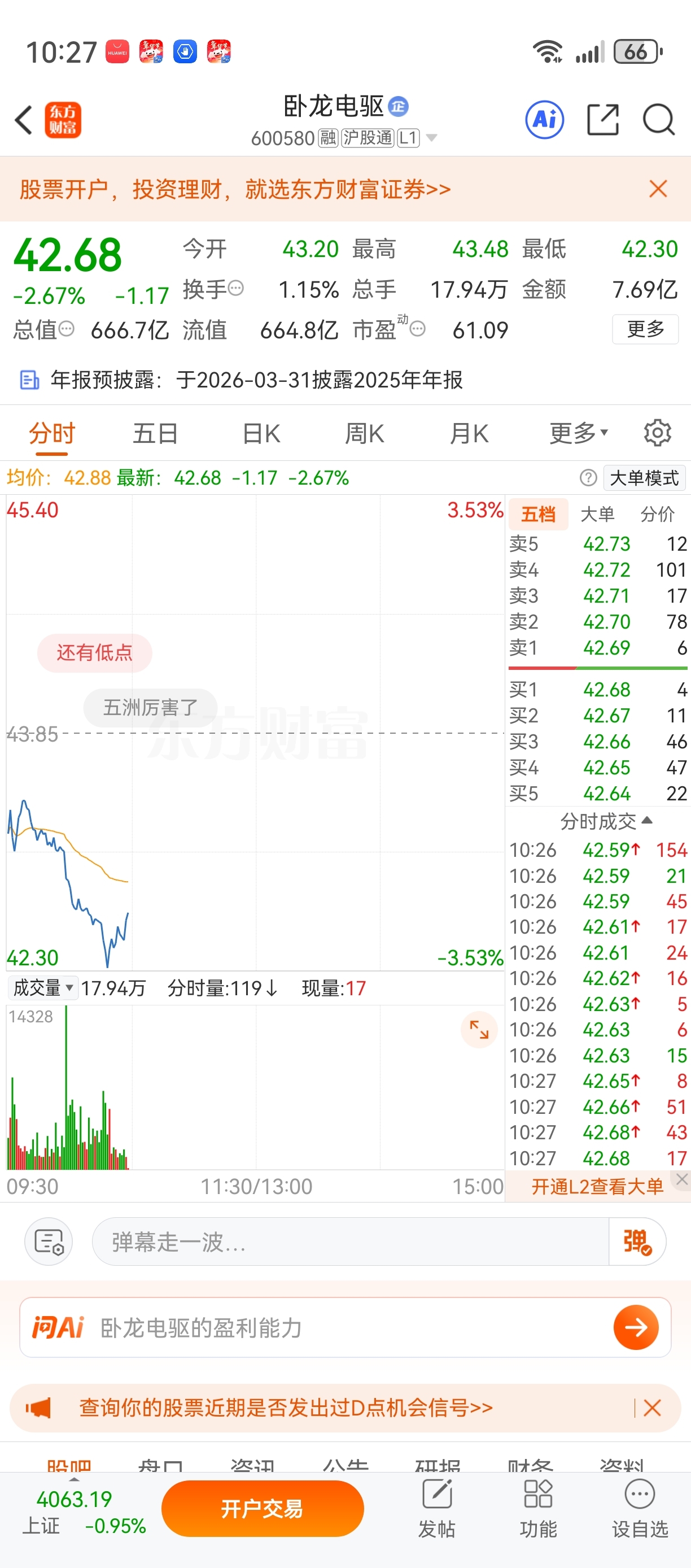 $卧龙电驱(SH600580)$ 42.30今天又来个回探支撑位。自我感觉到位了。今天有割肉走的吗?兄弟。越是临近春节,越心里感觉安全。唉!希望在下周。