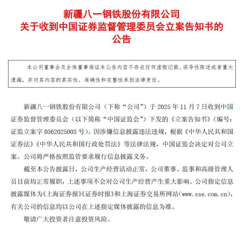 八一钢铁及控股股发被立案调查,近9万股东踩雷。截至2025年11月8日持有的投资者或可索赔挽损,以调查结果认定为准。敬请关注自身合法权益。