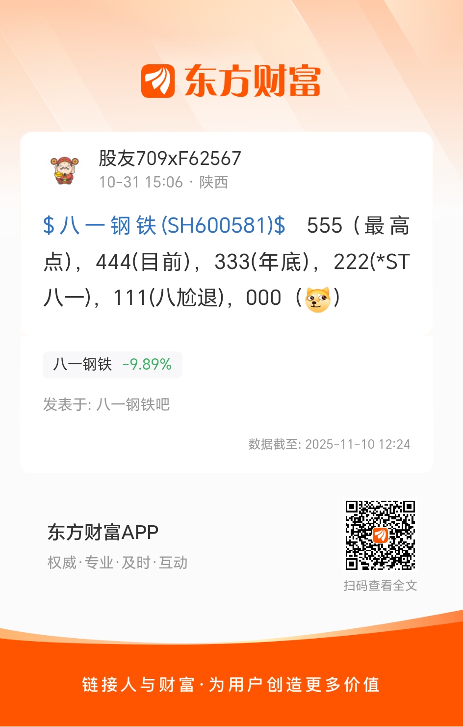 $八一钢铁(SH600581)$ 555 (最高点),444(目前),333(年底),222(*ST八一),111(八尬退),000(