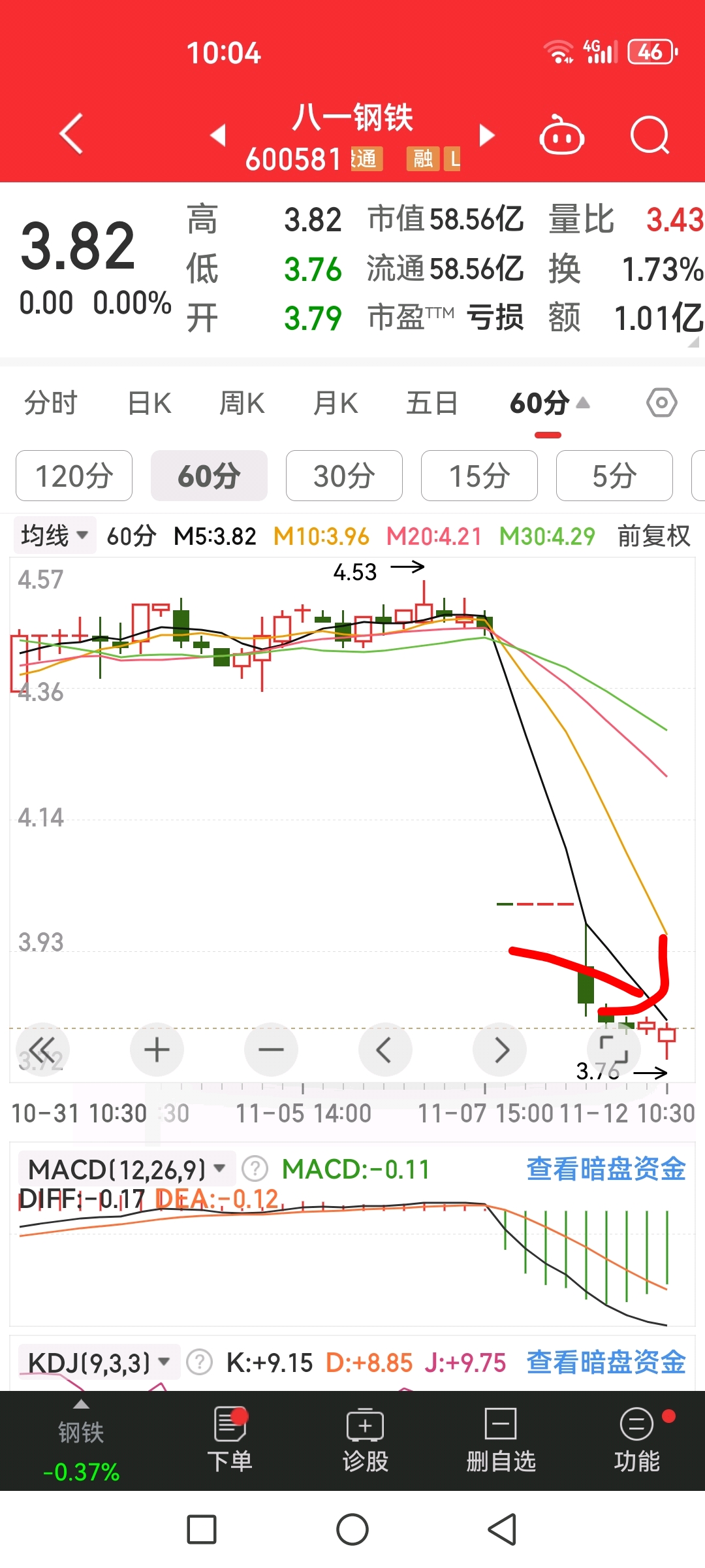 $八一钢铁(SH600581)$ 60分压死了赶紧走