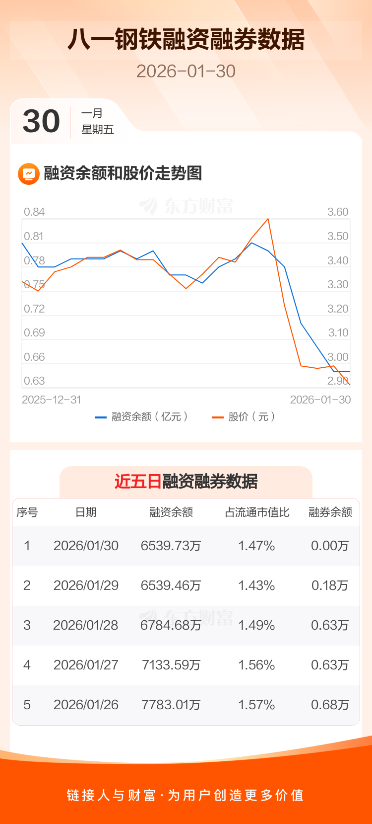 交易所最新数据显示,八一钢铁于2026年1月30日获融资买入145.67万元,融资偿还145.40万元,当日融资净买入2698元。目前,该股融资余额6539.73万,占流通市值比例为1.47%。