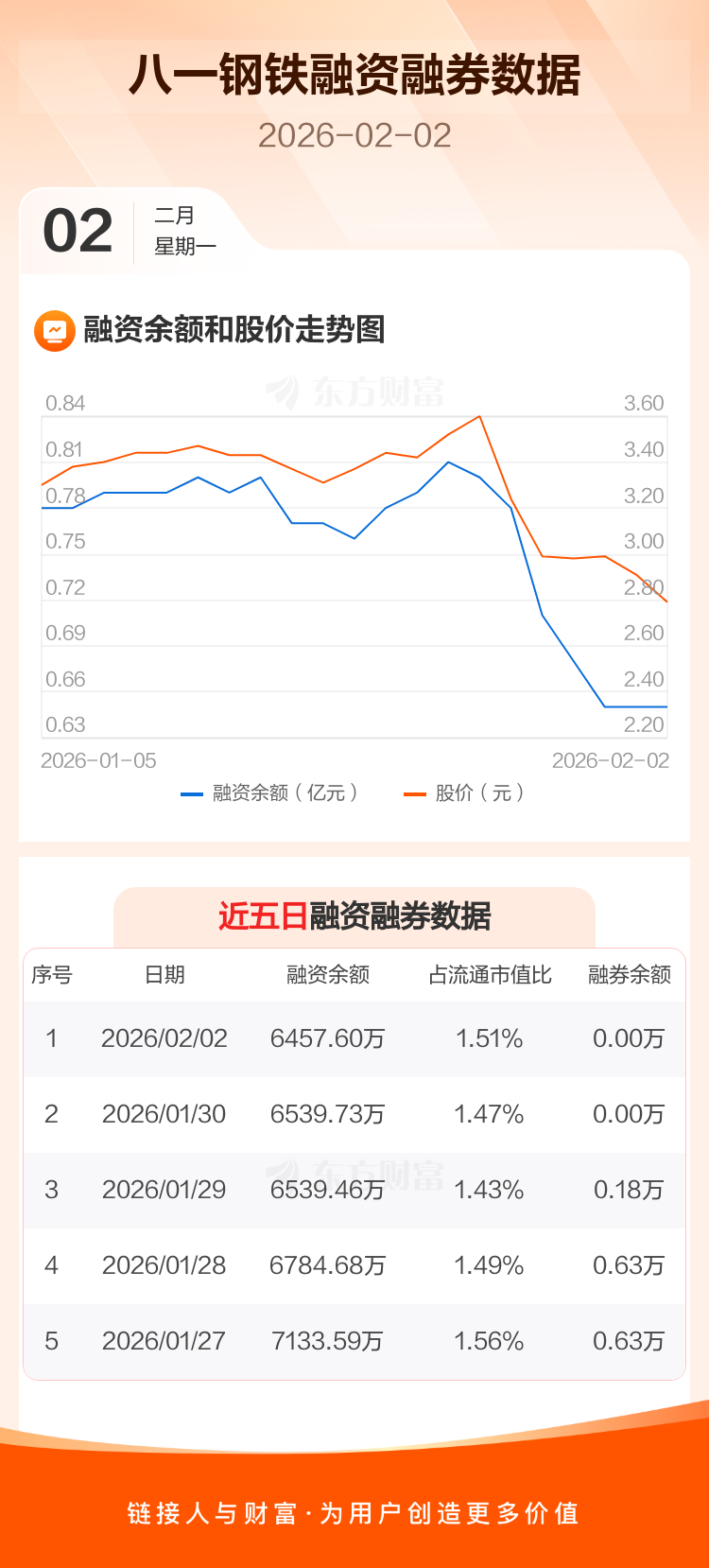 交易所最新数据显示,八一钢铁于2026年2月2日获融资买入104.08万元,融资偿还186.20万元,当日融资净偿还82.13万元。目前,该股融资余额6457.60万,占流通市值比例为1.51%。