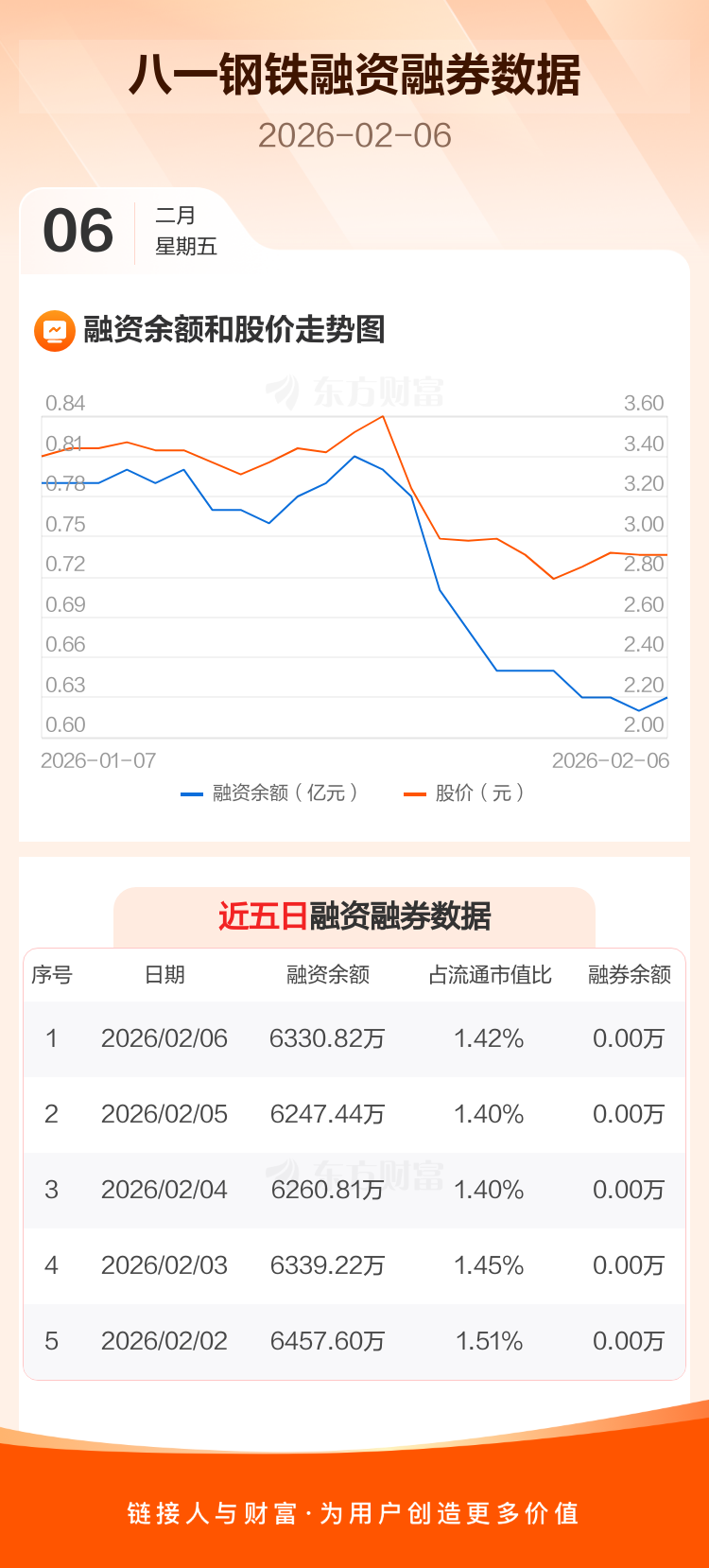 交易所最新数据显示,八一钢铁于2026年2月6日获融资买入123.70万元,融资偿还40.32万元,当日融资净买入83.38万元。目前,该股融资余额6330.82万,占流通市值比例为1.42%。