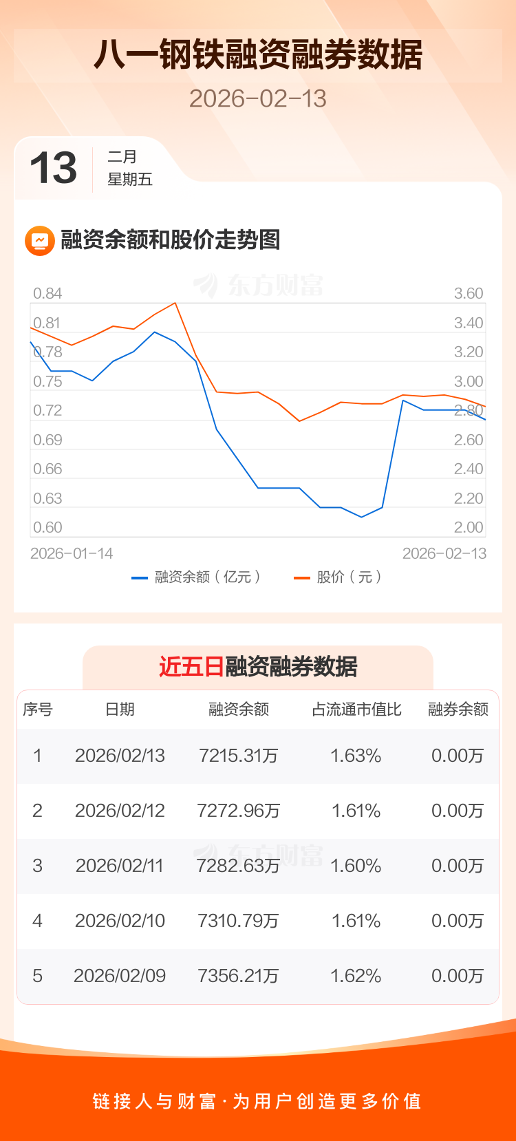 交易所最新数据显示,八一钢铁于2026年2月13日获融资买入13.48万元,融资偿还71.13万元,当日融资净偿还57.64万元。目前,该股融资余额7215.31万,占流通市值比例为1.63%。