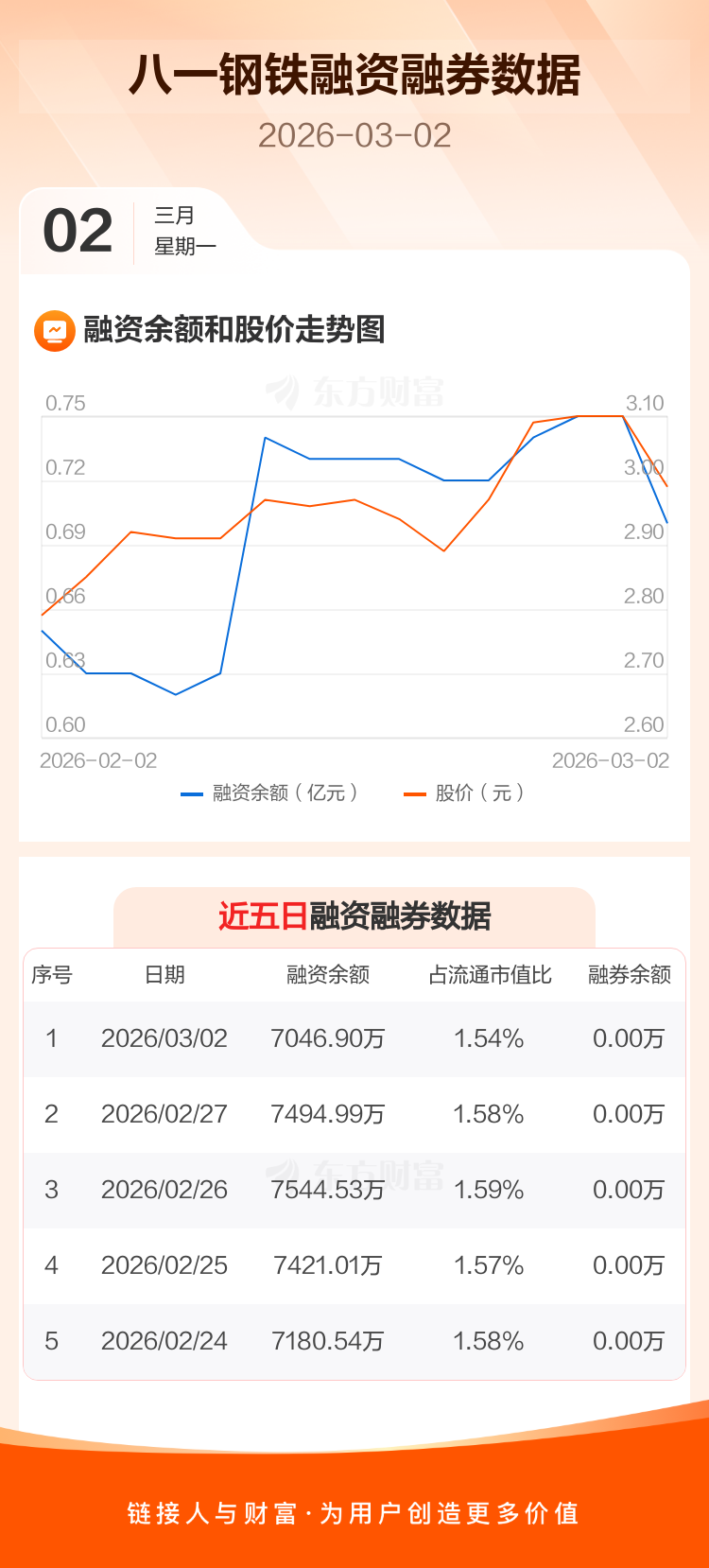 交易所最新数据显示,八一钢铁于2026年3月2日获融资买入146.26万元,融资偿还594.35万元,当日融资净偿还448.09万元。目前,该股融资余额7046.90万,占流通市值比例为1.54%。