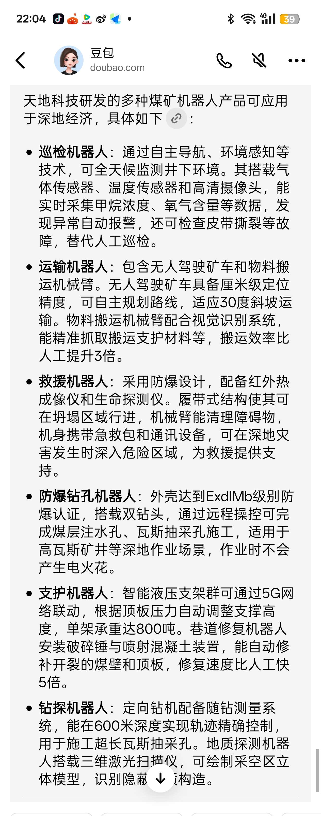 天地科技除了掘进机产品外还有六种机器人产品可以用于深地经济。投资价值待挖掘,机构