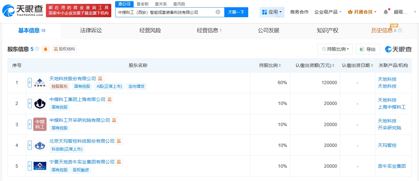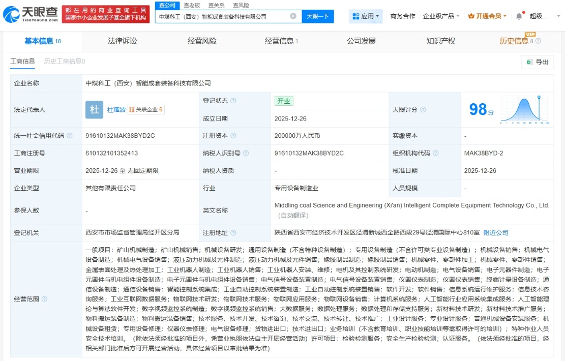 每经AI快讯,天眼查App显示,近日,中煤科工(西安)智能成套装备科技有限公司成立,法定代表人为杜耀波,注册资本20亿元人民币,经营范围包括矿山机械制造、矿山机械销售、机械设备研发、通用设备制造等。股东信息显示,该公司由天地科技(600582)、中煤科工集团上海有限公司、天玛智控(688570)等共同持股。