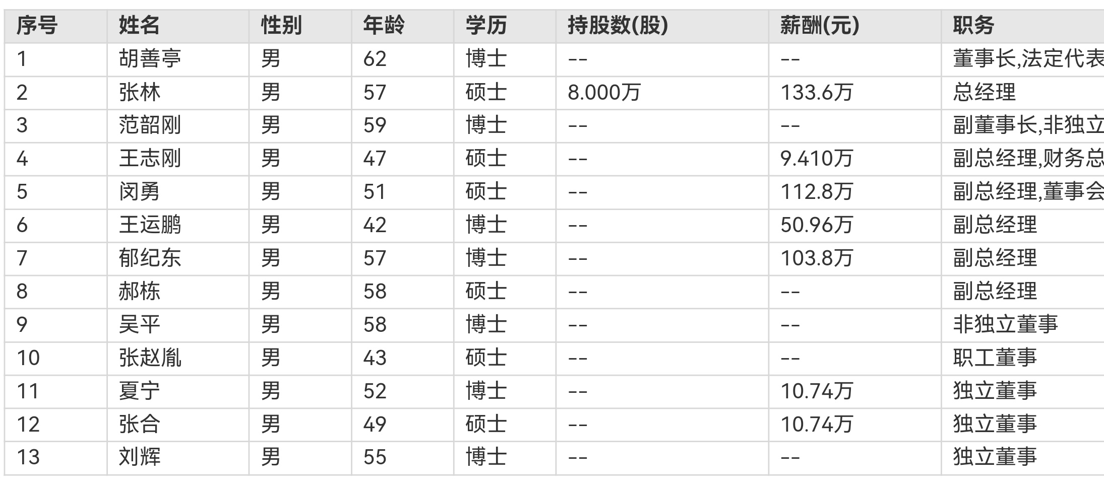 13名核心高管,7位博士6位硕士,张持有8万股,胡今年63岁了,该退了……