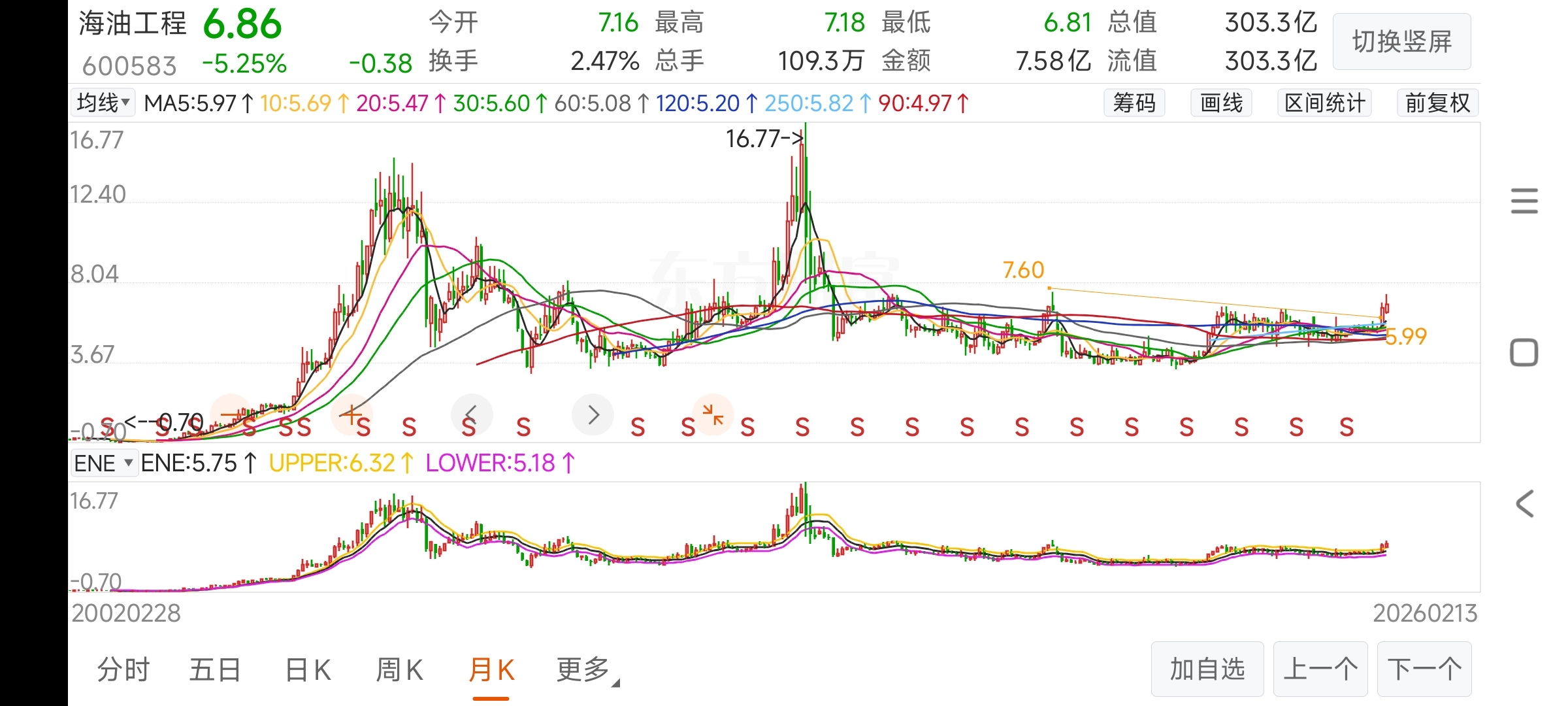 $海油工程(SH600583)$ 这个月线复合头肩底反转买入点6块丽丽最小涨幅至9.6