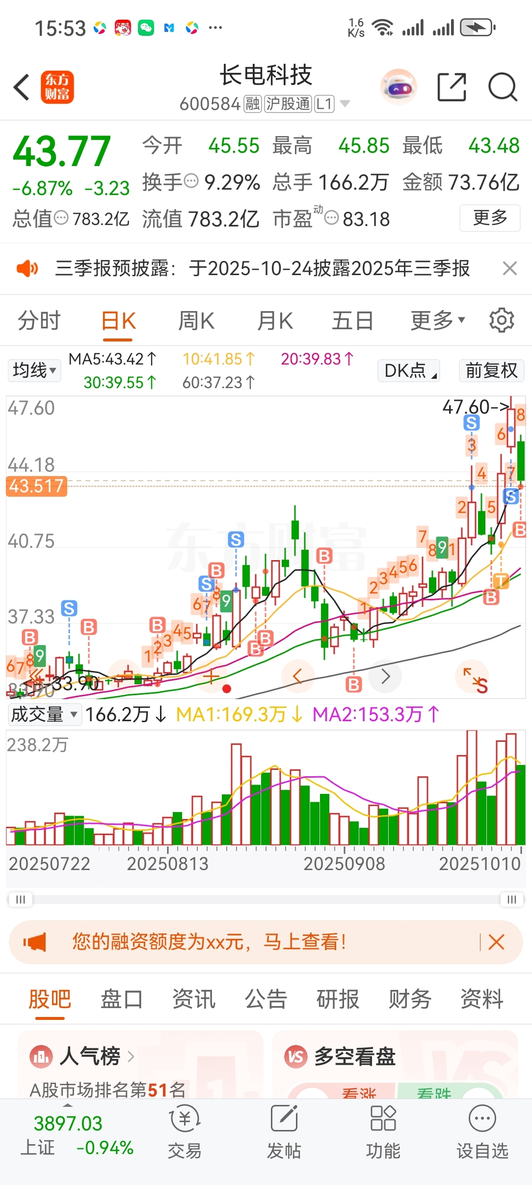 $长电科技(SH600584)$ 今天主要把弱势股清仓,没想买。43.5挂了个篮子谁知还真买到了。9月25号43.5卖的,折腾了两个来回今天原价又买了回来。这个价位可上可下,下周一10日均线上挂篮子再加。