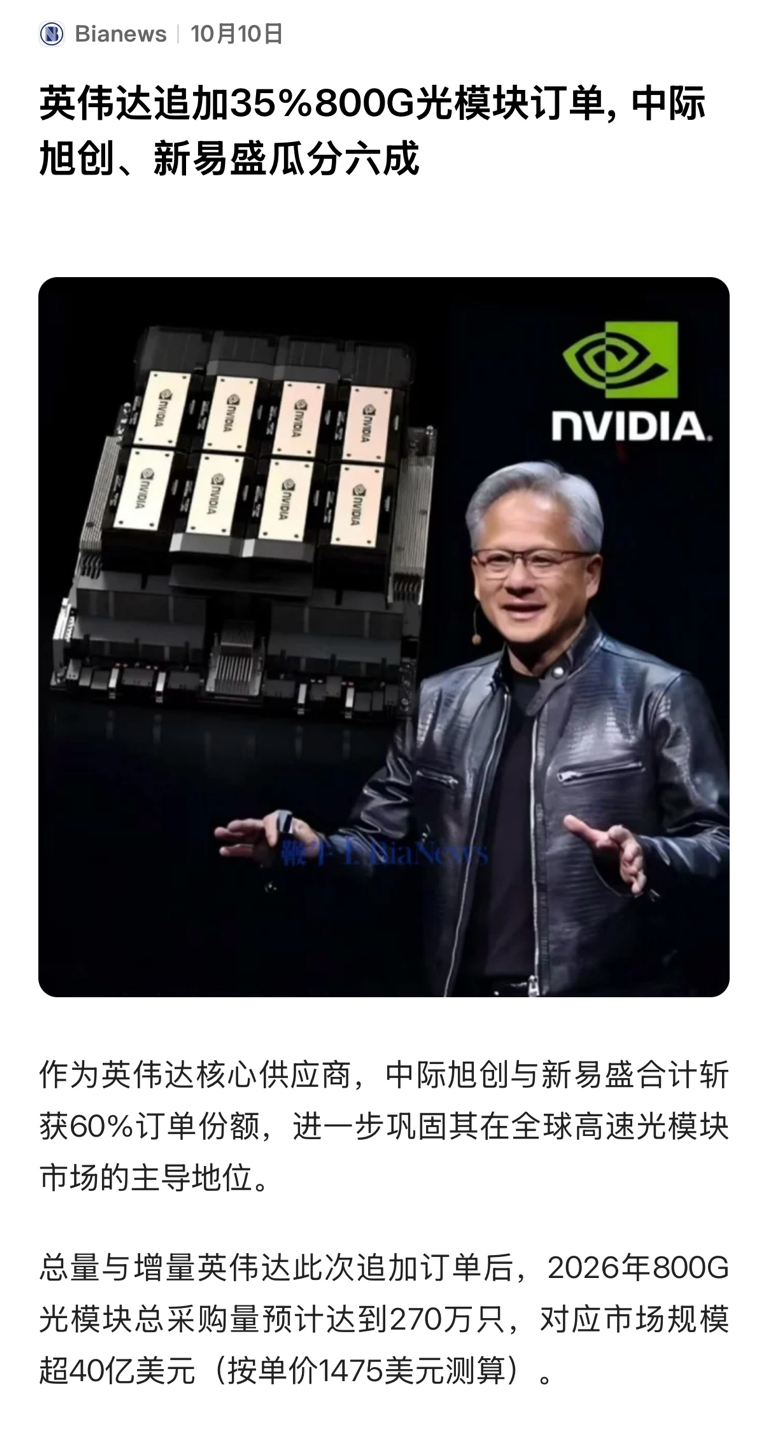 【英伟达追加35%800G光模块订单,中际旭创、新易盛瓜分六成】长电科技为中际旭