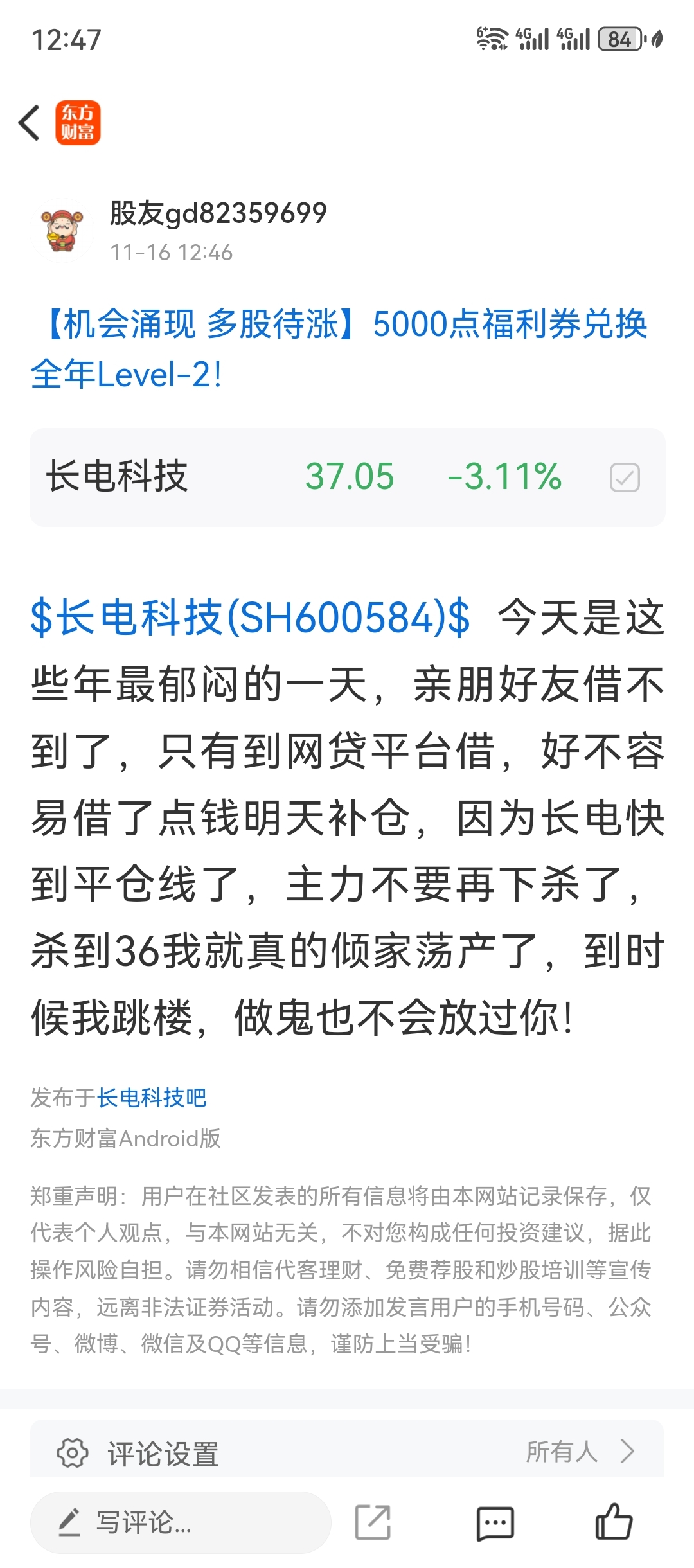 温馨提示: 1.根据《证券法》规定,禁止编造、传播虚假信息或者误导性信息,扰乱证券市场;2.用户在本社区发表的所有资料、言论等仅代表个人观点,与本网站立场无关,不对您构成任何投资建议。用户应基于自己的独立判断,自行决定证券投资并承担相应风险。《东方财富社区管理规定》