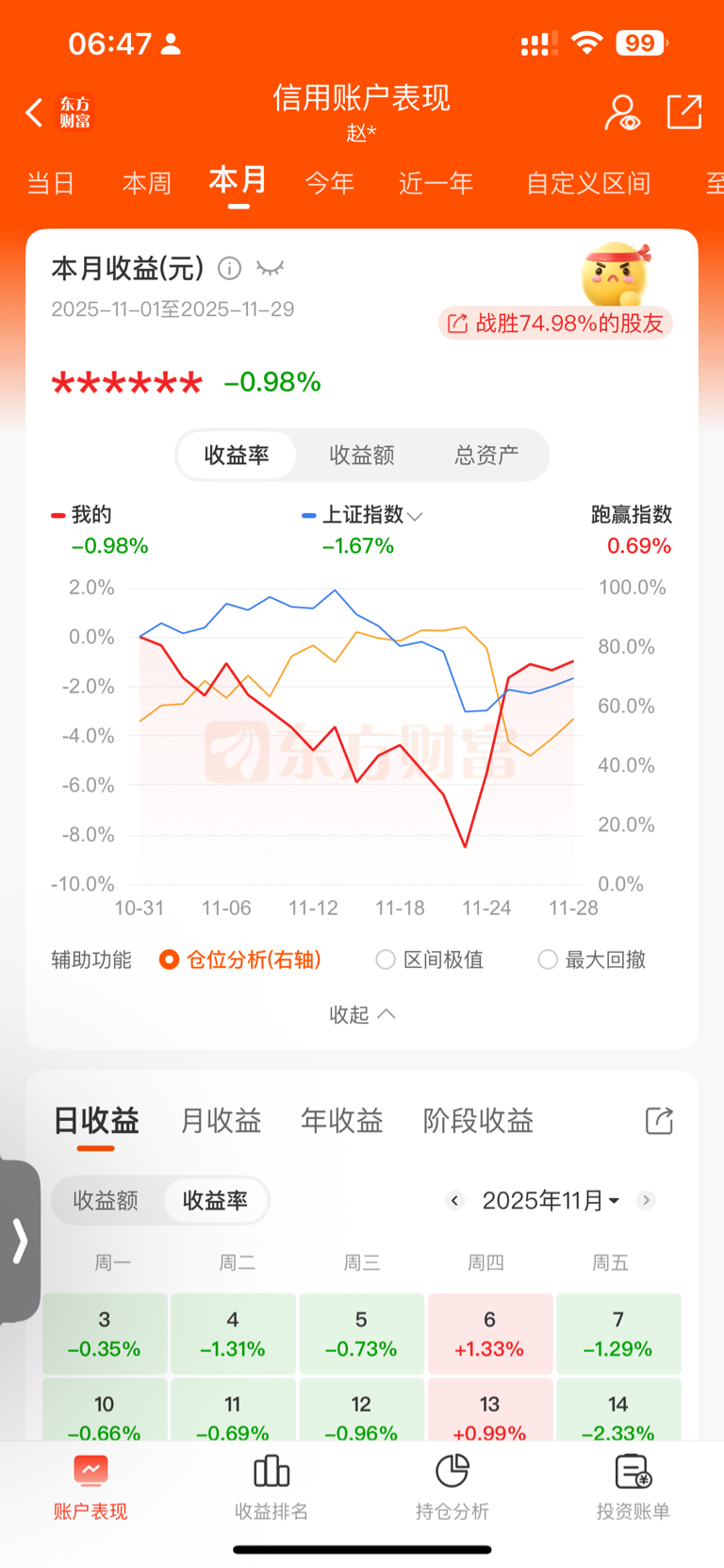 受长电拖累本月绿肥红瘦最终跑赢指数输了钱打破了我的月线5连阳,希望12月能够挽回