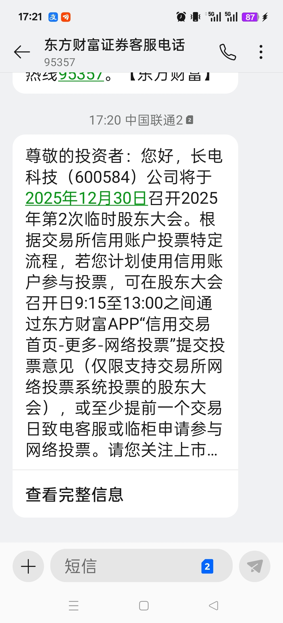 今天看到别人新股中签,东财来了个信息,我还以为通知我缴费的,没想到,你个长电开会