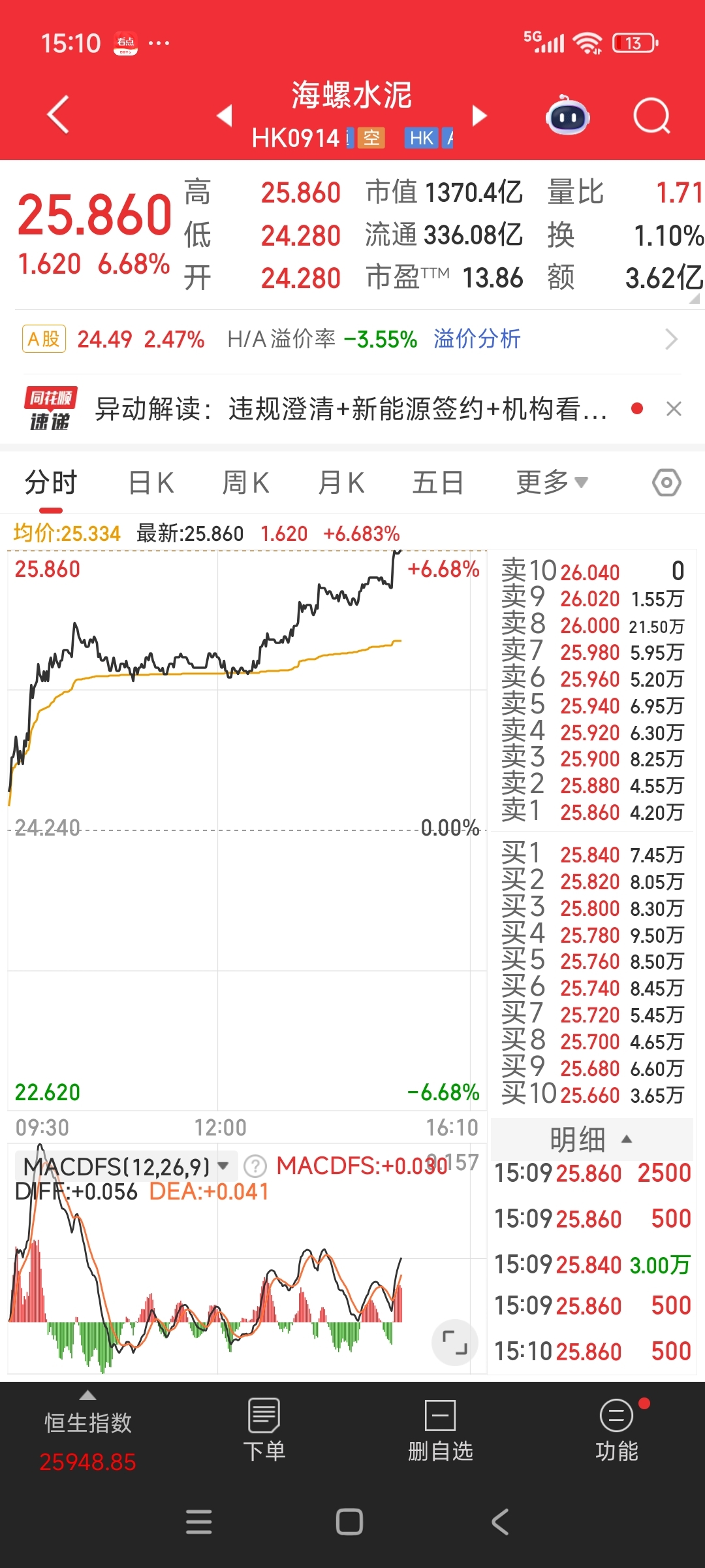 $海螺水泥(SH600585)$ 港股还在涨,是一个妈生的吗