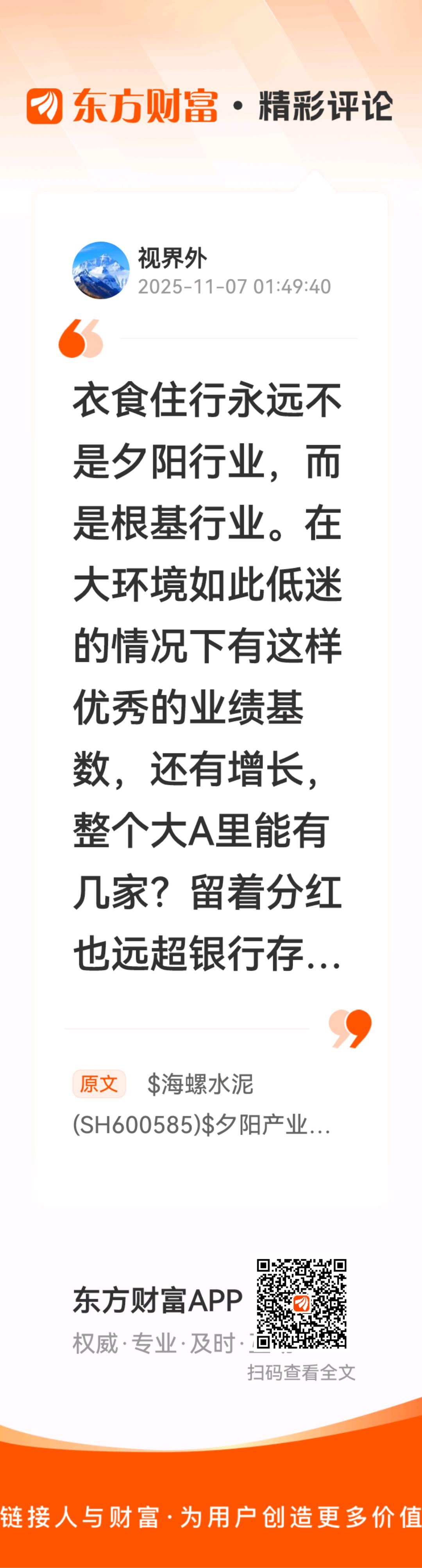 //@视界外 :衣食住行永远不是夕阳行业,而是根基行业。在大环境如此低迷的情况下有这样优秀的业绩基数,还有增长,整个大A里能有几家?留着分红也远超银行存款利息,珍惜此时此刻。。