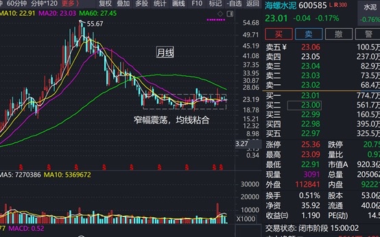$海螺水泥(SH600585)$ 月线看,自2023年1月起到现在一直在窄幅震荡中,在趋势未选择方向前,交易难度大。日线上看,仍然在下跌趋势中,这种走势下操作技术不高的朋友暂不建议介入,待股价逐渐走平、抬头后再进行右侧交易。