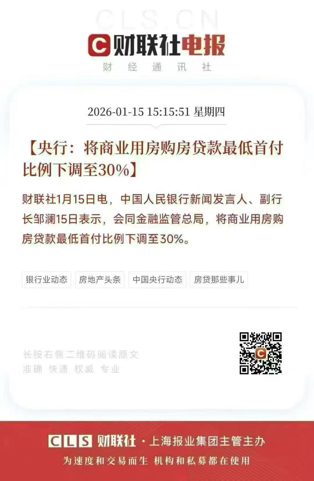 央行:将商业用房购房贷款最低首付比例由50%下调至30%