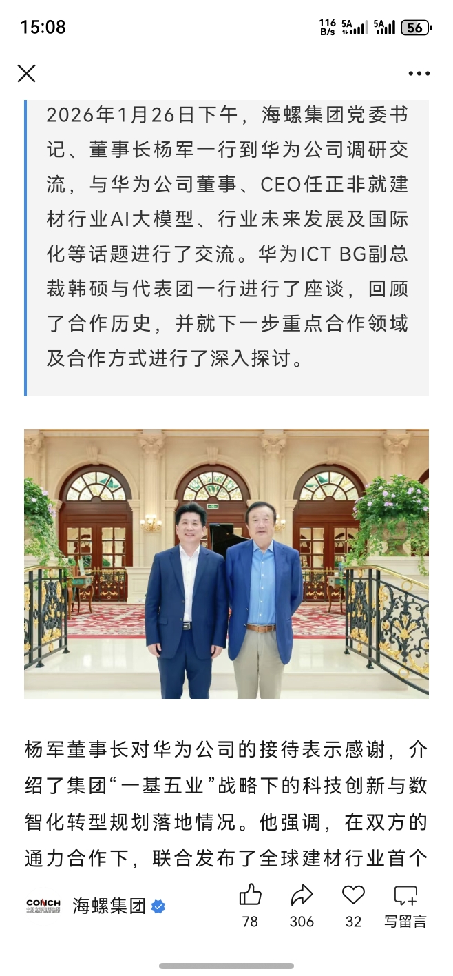$海螺水泥(SH600585)$ 华为借壳水泥,市值二十万亿