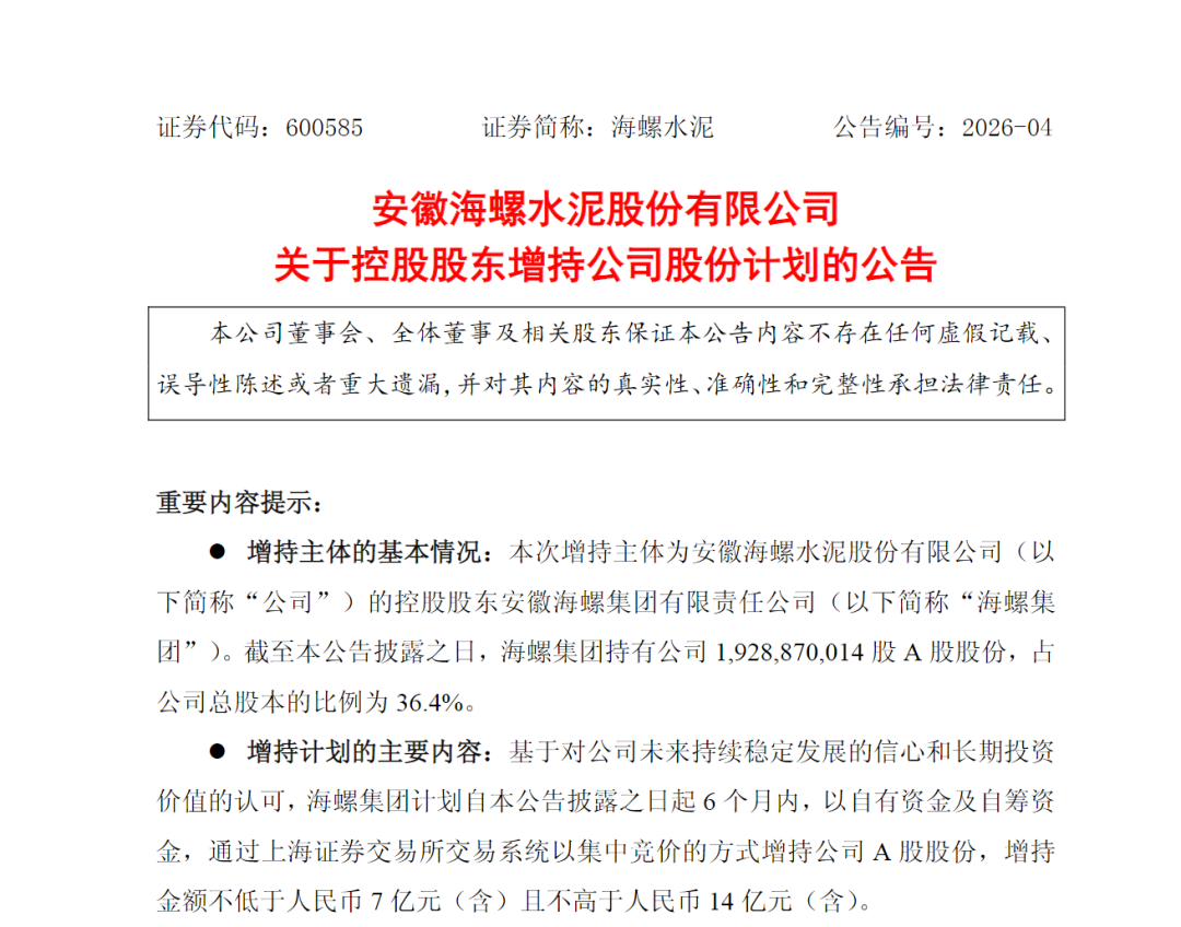 最高14亿元!“水泥茅”获大股东增持