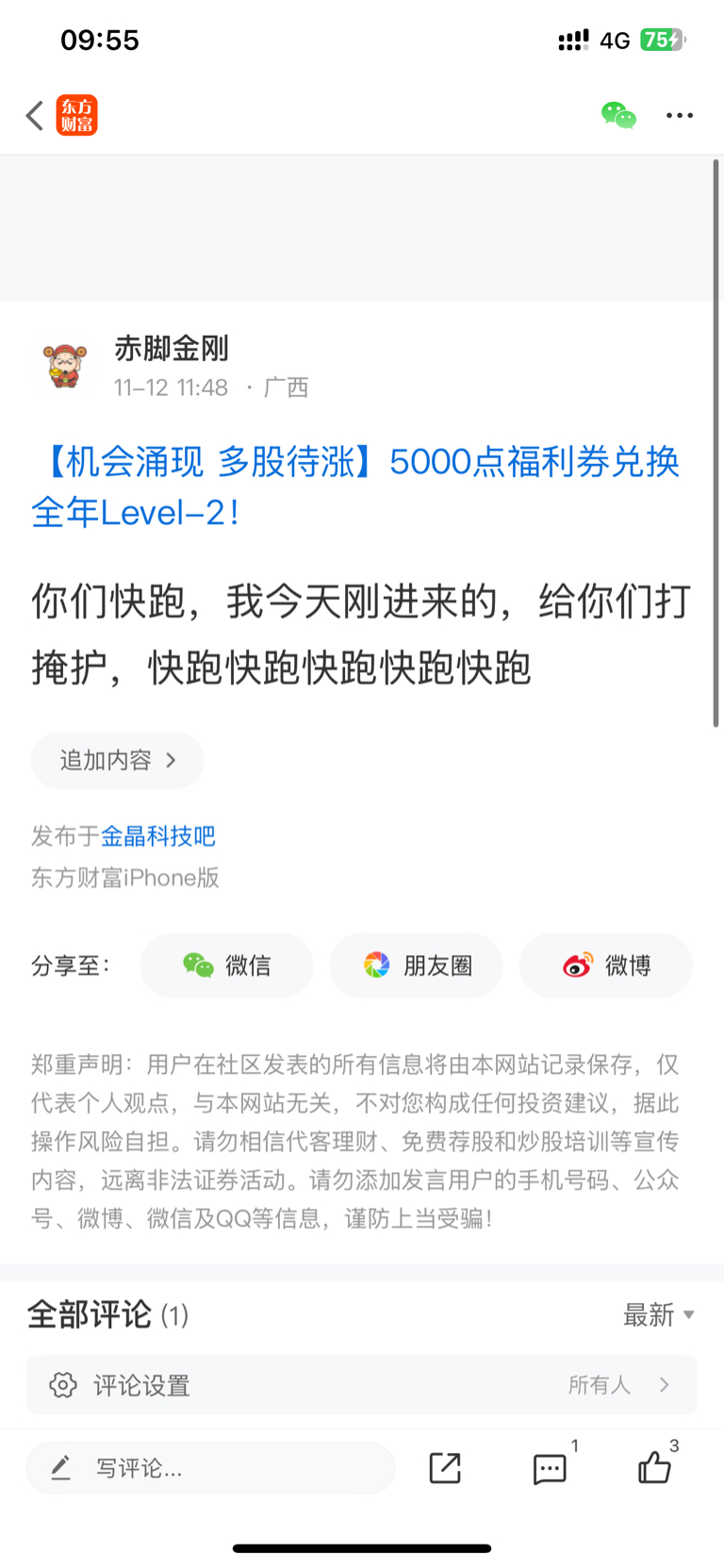 温馨提示: 1.根据《证券法》规定,禁止编造、传播虚假信息或者误导性信息,扰乱证券市场;2.用户在本社区发表的所有资料、言论等仅代表个人观点,与本网站立场无关,不对您构成任何投资建议。用户应基于自己的独立判断,自行决定证券投资并承担相应风险。《东方财富社区管理规定》