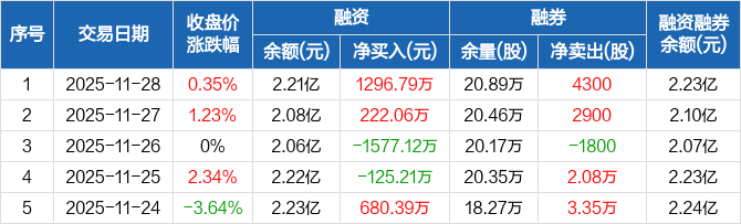 融资方面,当日融资买入2306.52万元,融资偿还1009.73万元,融资净买入1296.79万元。融券方面,融券卖出9000股,融券偿还4700股,融券余量20.89万股,融券余额120.74万元。融资融券余额合计2.23亿元。
